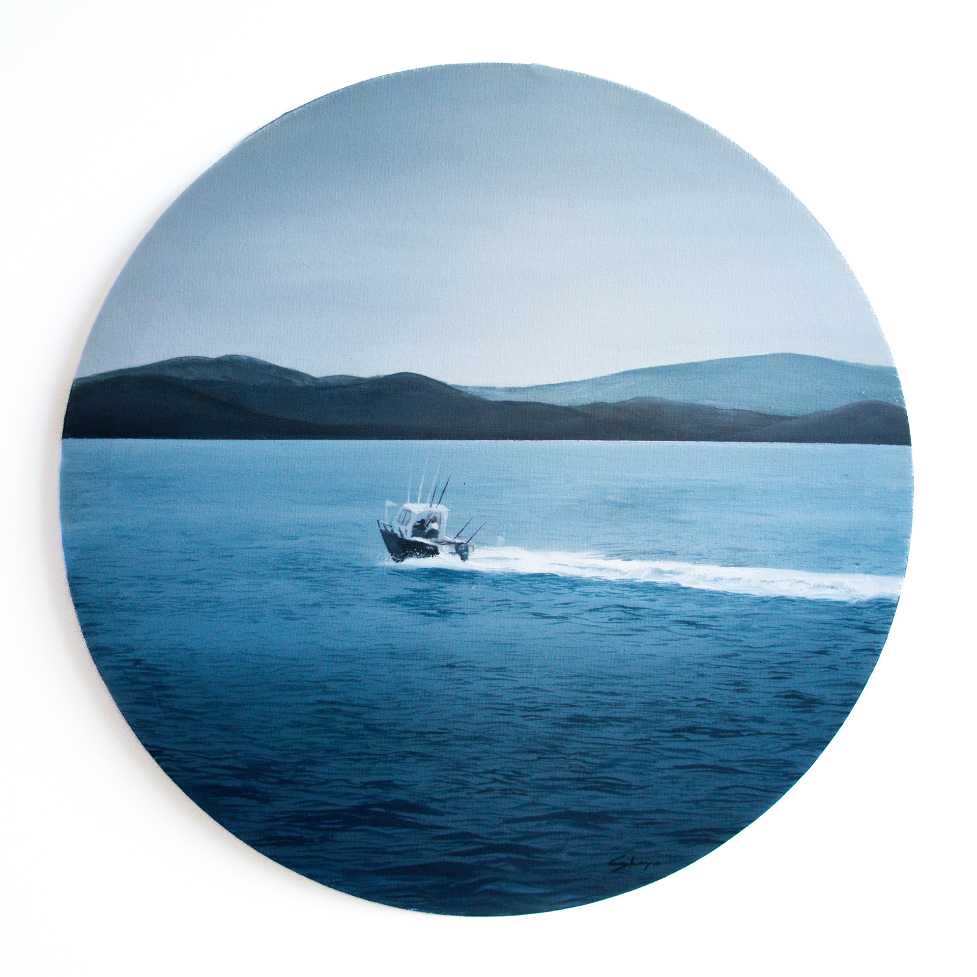 This painting captures a moment from a whale watching tour at Nelson Bay that I knew I had to preserve on canvas. The sea was perfectly calm that day, disturbed only by the occasional whale breach or passing vessel. But that's exactly what made it so captivating - this small fishing boat cutting through the serene waters, framed by hills in the distance, created the perfect composition. The instant I pressed the shutter, I felt the urge to recreate this scene in paint. There was something about the tranquil beauty of that moment - the boat's gentle wake against the still water, the layered blues of sea and sky - that I wanted to share with others. Every brushstroke was an attempt to pass along that same sense of peace and wonder I felt standing on the deck that day.
