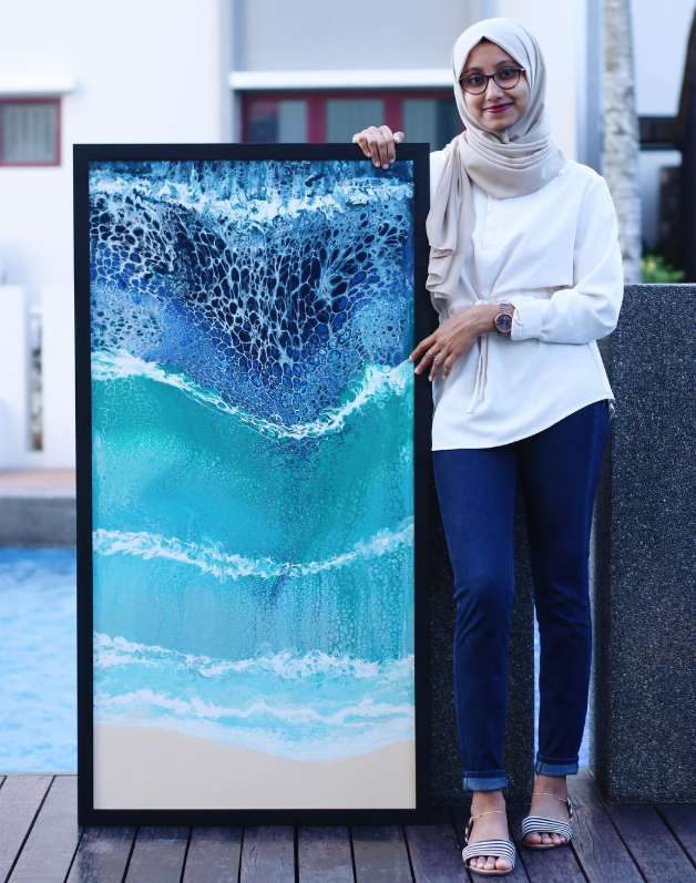 The 24 x 48 inch acrylic pour on canvas painting titled Shades of Ocean was created for Unveiling Visions 2018, an art exhibition held in the Maldives. Capturing the fluid beauty and depth of the sea, the piece reflects the movement, mystery, and ever-changing hues of ocean waters.