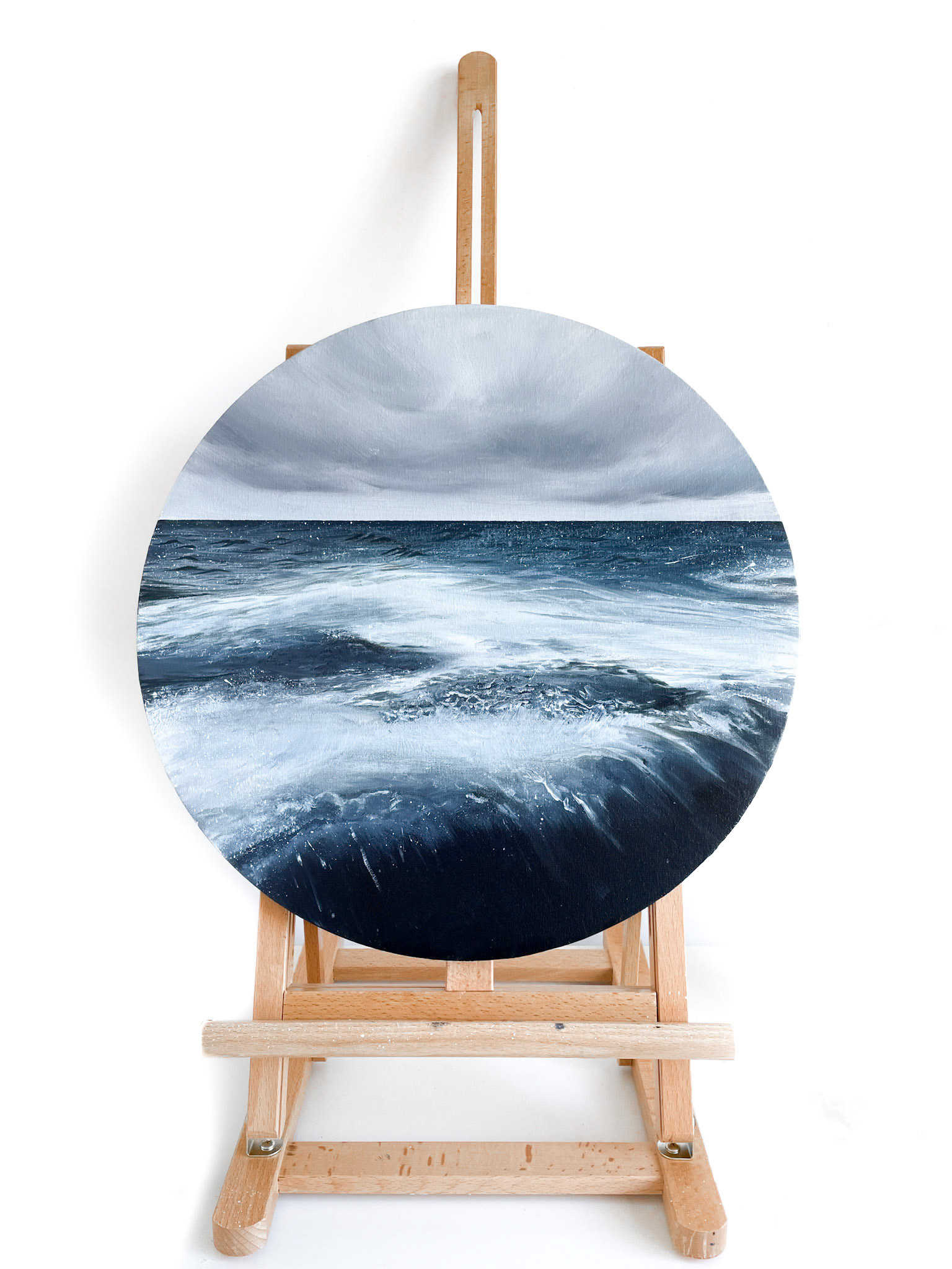 The sea churns with restless energy, waves rising and folding in shades of deep blue, steel grey and frothing white. Each crest surges forward before breaking apart, scattering spray into the wind as if the ocean itself is breathing.