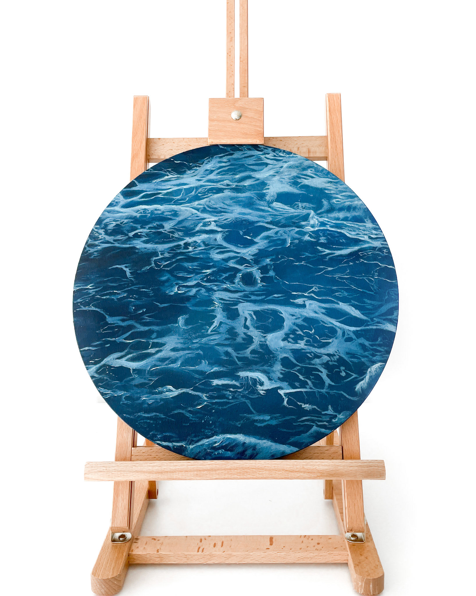 A round window into the restless heart of the sea, layers of blue swirl and fold into one another, each wave crest catching the light before dissolving into foam. The brushwork is alive with motion, capturing the ocean’s shifting moods: the gentle pull of the tide, the sudden lift of a swell, the quiet breath between waves.