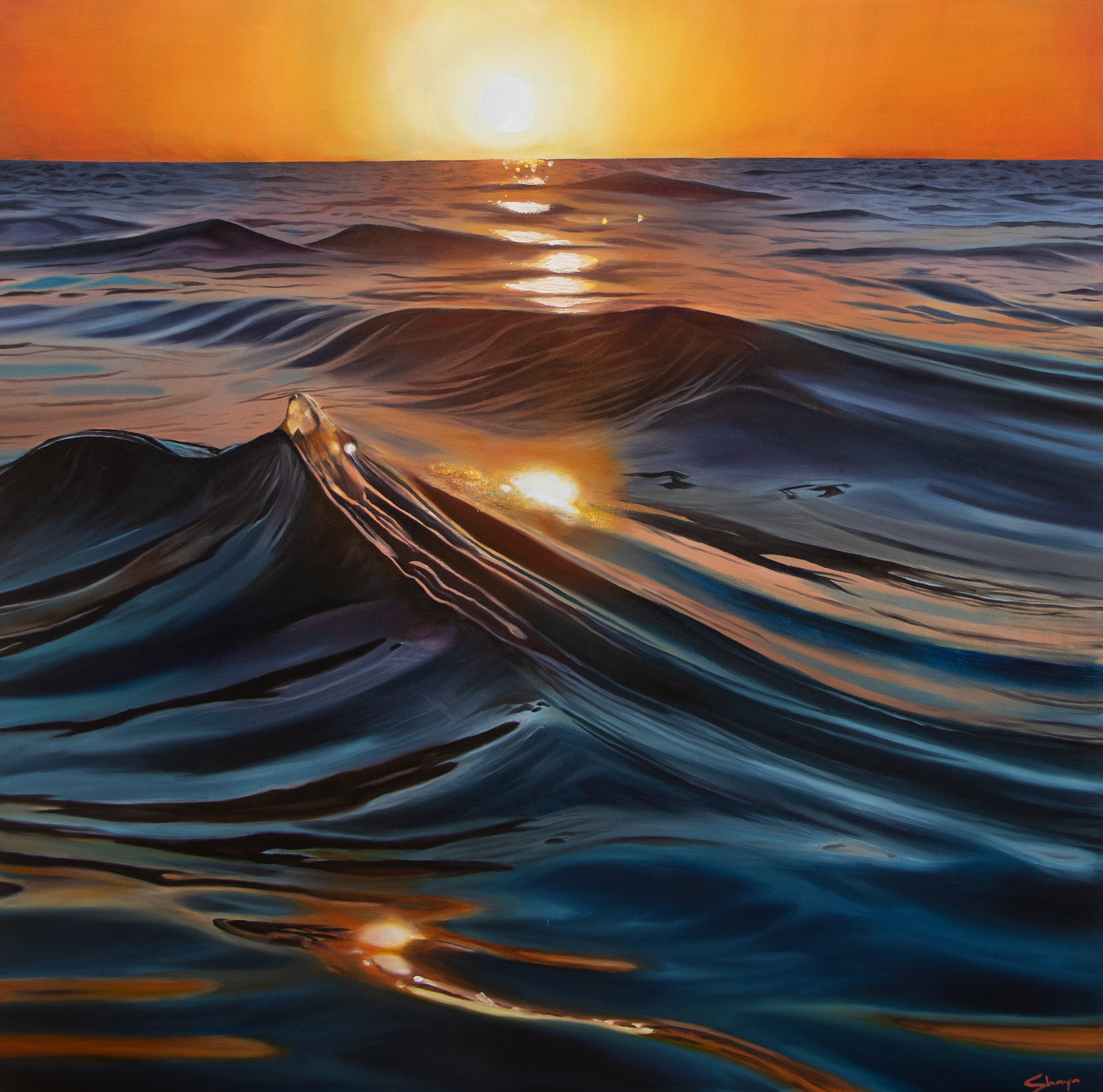 “Sunset Serenade” is a 40x40 inch oil painting that captures the vibrant beauty of the ocean at sunset, that magical moment when sunlight meets the sea as day gently fades into night. Warm tones of gold and orange melt into deep ocean blues, creating a sense of harmony, calm, and quiet wonder.