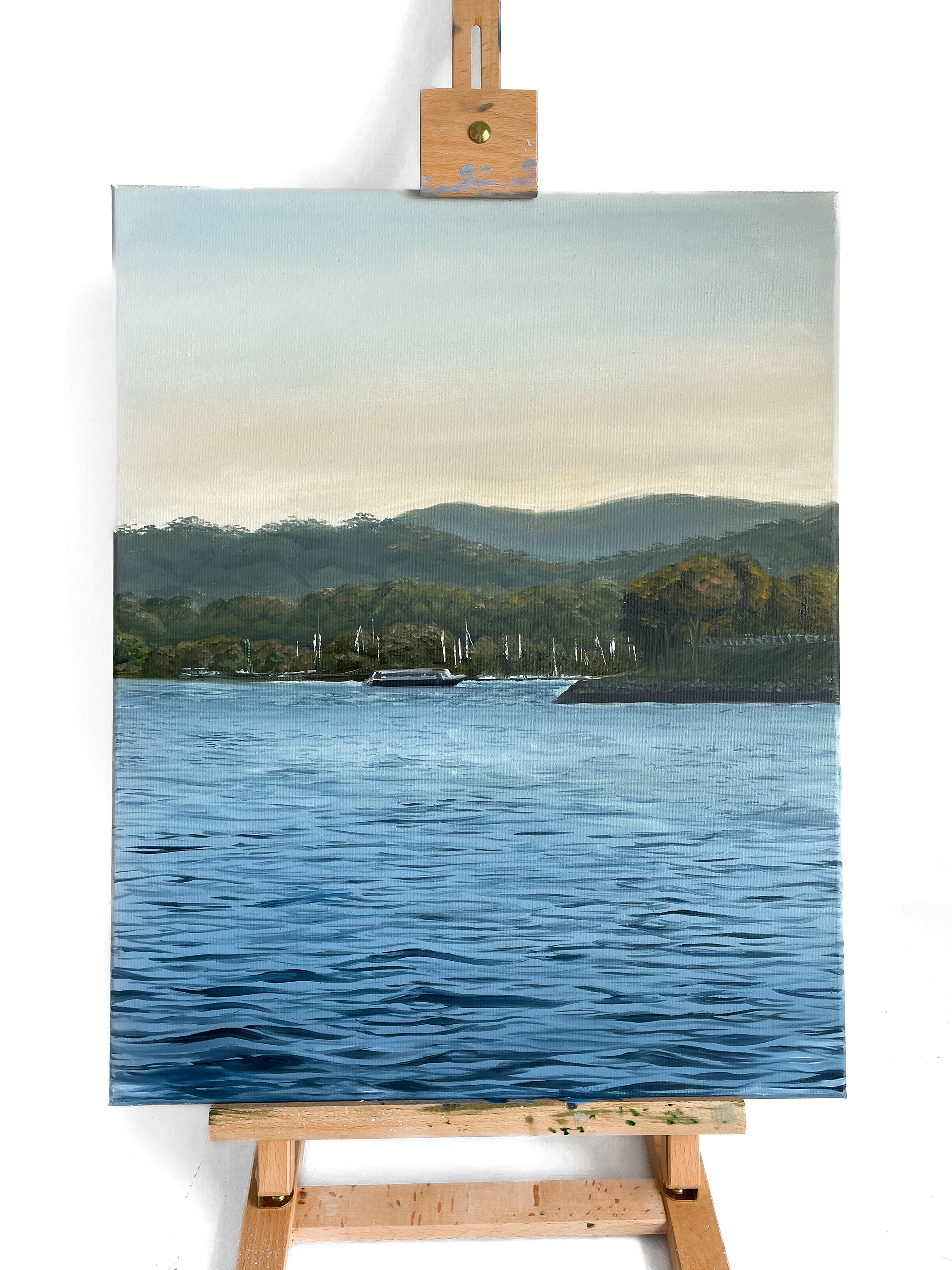 This moment was captured at Lake Macquarie from Warners Bay, close to sunset. The painting brings back the same deep sense of peace I felt sitting by the water's edge, watching pelicans and seagulls glide gracefully while boats drifted quietly across the lake. The gentle hills and trees created a perfect backdrop for this tranquil scene. There's something about this view that makes you slow down and truly appreciate your surroundings - the kind of moment that helps you breathe deeply and take it all in after a busy day. Every time I look at this painting, I'm transported back to that serene evening when the world felt perfectly still and beautiful.
